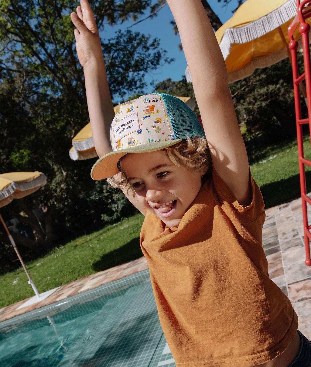 Découvrez la Casquette pour enfants et bébés, Miami Beach. Style trucker premium, motif solaire, visière courbée, disponible dès 9 mois. Pour les garçons : elle est à porter avec le maillot de bain du même Nom. Profitez-en.