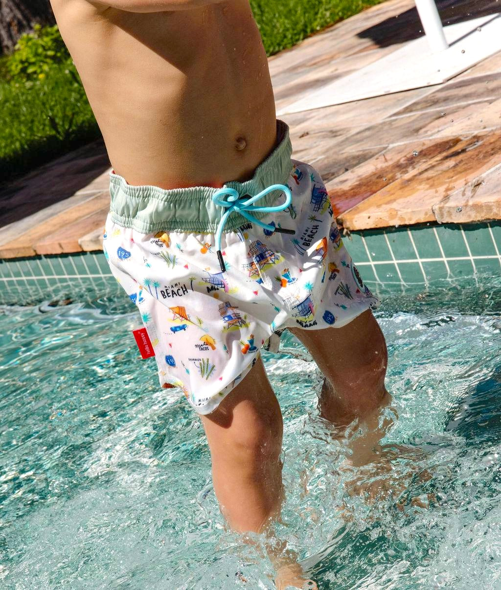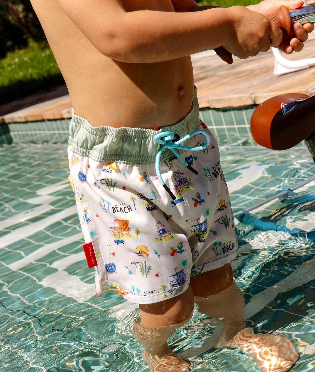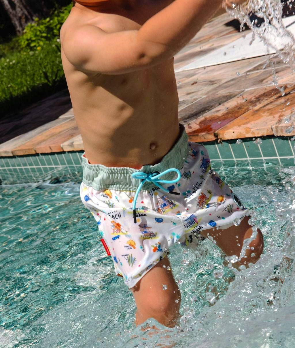Craquez pour le Maillot de bain pour garçons, Miami Beach. Imprimé inédit, anti-UV, confortable et résistant. Taille élastique avec cordon ajustable, parfait pour les journées plage ou piscine. À matcher avec nos accessoires du même Nom. De 3 à 8 ans.